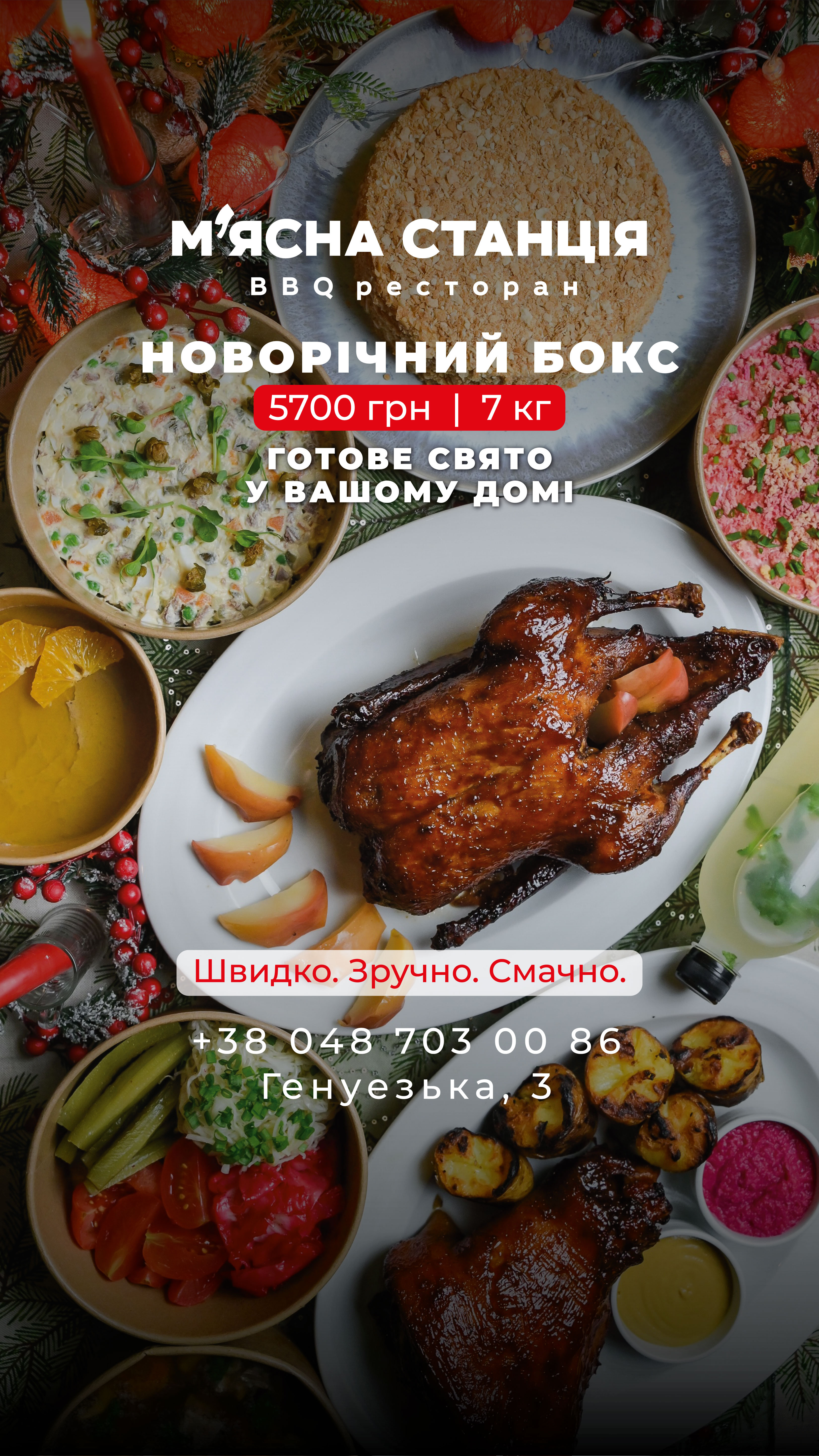 У боксі: <br>- холодець 700г <br>- Олівʼє 500г <br>- Курячий паштет 300г <br>- Соління 400г <br>- Оселедець під шубою 500г <br>- Рулька 1200г <br>- Качка 1400г <br>- Наполеон 1000г <br>- Лимонад 1л