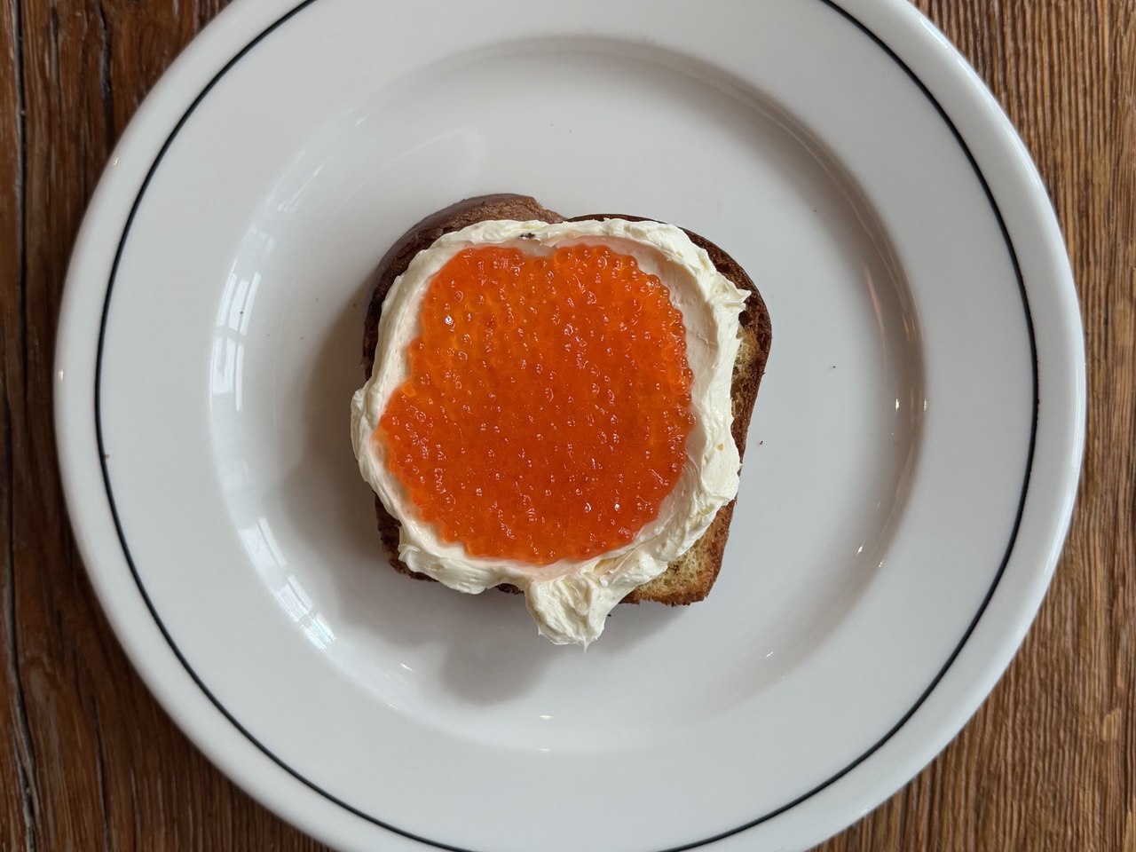 Підсмажений бріош, взбите вершкове масло та ікра форелі.