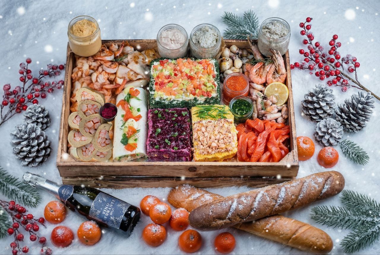 Холодні закуски: <br>- Лосось гравлакс 500г <br>- Форшмак із оселедця матіас по-одеськи 200г <br>- Паштет з тунця по-французьки 200г <br>- Багет білий та темний 600г <br>- Збите масло з цедрою лимона 100г <br> <br>Салати: <br>- "Мімоза" з запеченим лососем 500г <br>- Оселедець під шубою 500/100г <br>- Рулет "Олів'є" з лососем слабої солі 500г <br> <br>Гарячі страви: <br>- Веллінгтон з лосося (лосось, запечений у листковому тісті з крем-сиром ташпинатом) 500г <br>- Короп в кисло-солодкому соусі 1000г <br>- Хвости білоногих креветок по-французьки 500г <br> <br>Святкове доповнення: <br>- Біле ігристе вино "Vino Spumante brut" (Італія) 750мл <br>- Мандарини 1000г