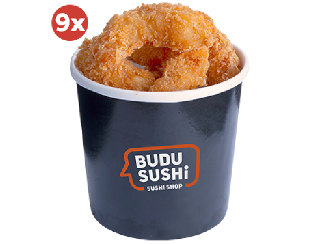 Креветки в темпурі, паровий японський рис, соус тонкацу, водорості чука, кунжут мікс.