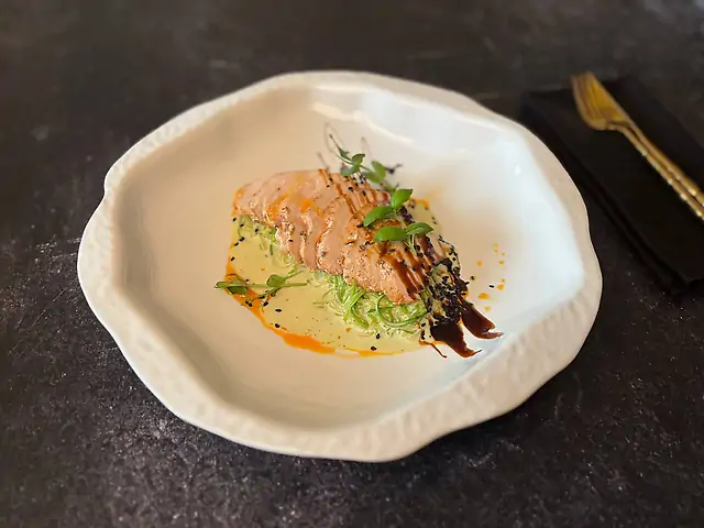 Соковиті медальйони зі справжнього делікатесу - телячого язика на подушці з карпаччо з цукіні, вершкового картопляного пюре та соусу Демігляс.