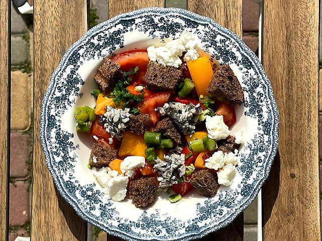 Пряна томатна основа з червоного соусу власного виробництва. Додаємо: цибулю , різнокольоровий перець, томати, зелень, два рідких яйця, витриману коров'ячу бринзу, трохи перецю Чилі.