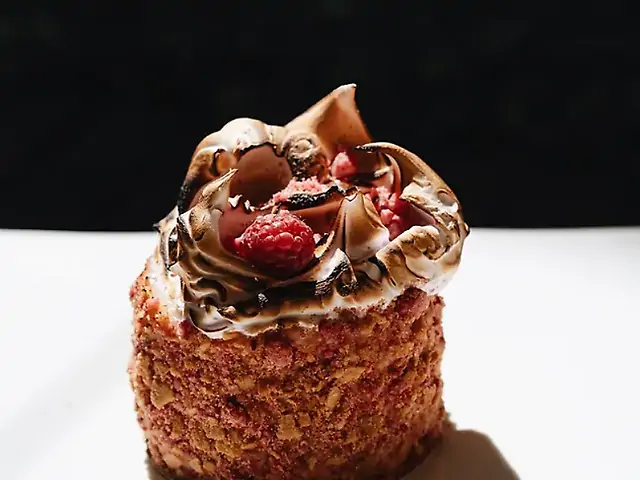 Фісташковий прошарок насичено горіховий на пасті зі смажених ядер фісташок.Верхня малинова частина з додаванням малинової пасти та сублімованої ягоди. Усіяно зверху крихтою малинового печива.