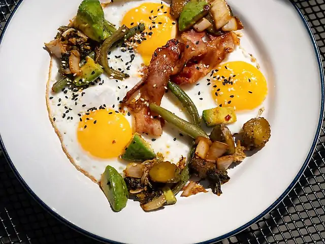 Яєшня з тьох яєць з карамелізованим беконом, авокадо, смаженою спаржевою квасолею й смаженим кімчі, прикрашаємо кунжутом