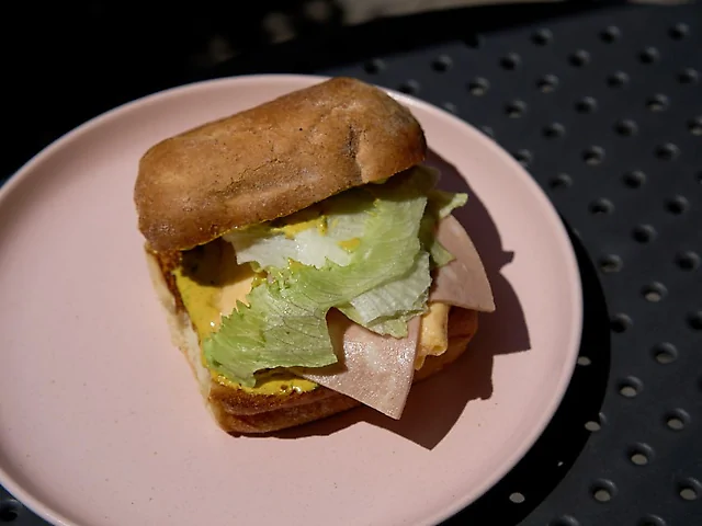 Туна мелт сендвіч, обсмажений на вершковому маслі + начинка з тунця та соус бешамель, а також зелена цибуля, бутони каперсів, мариновані огірки, кріп, петрушка, м'ята + чедер, сулугуні і шрирача майо. Прикрашаємо зеленим соусом бешамель, посипаємо петрушкою і подаємо з міксом салату.