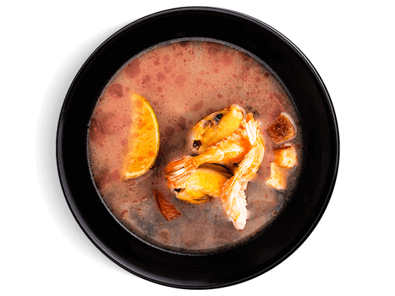 Бульон куриный, шампиньоны, листья лайма, лемонграсс, креветка тигровая, мидии, шрирачи, рыбный соус, кокосовое молоко, помидор, лайм