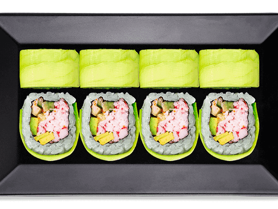 Нори, рис, васаби, салат айсберг, краб, замес сырный, соус унаги, укроп.