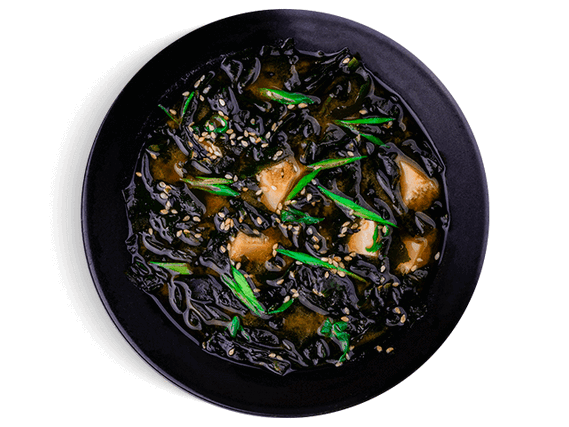 Мисо паста, водоросли вакаме, шампиньоны, сыр тофу, микс кунжута, лук зеленый.