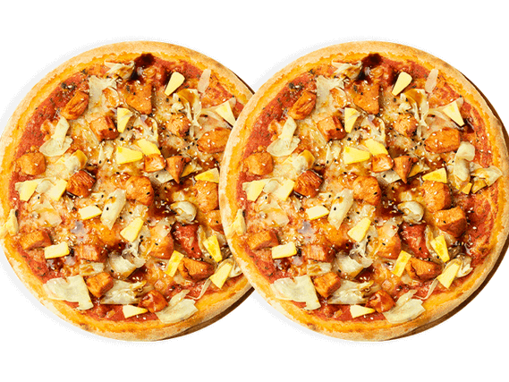 Тесто, соус томатный, сыр моцарелла, филе куриное в соусе терияки, ананас, имбирь, микс кунжута, соус терияки