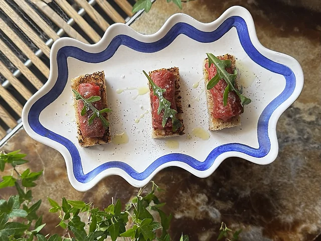 Тартар з рубленої яловичої вирізки з грильованими артишоками, каперсами та витриманим сиром