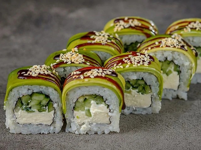 Рис,нори, сир філадельфія, огірок, авокадо. Соус 8 шматочків