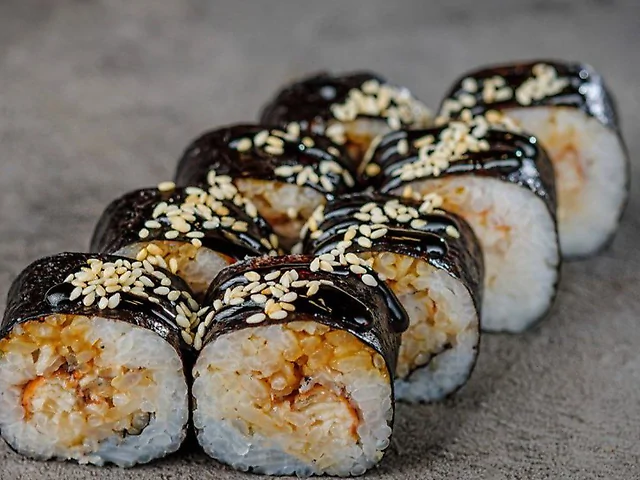Рис,нори, сир філадельфія, лосось, вугор копчений, авокадо ,унагі соус, кунжут, імбир, васабі, соєвий соус. 8 шматочків