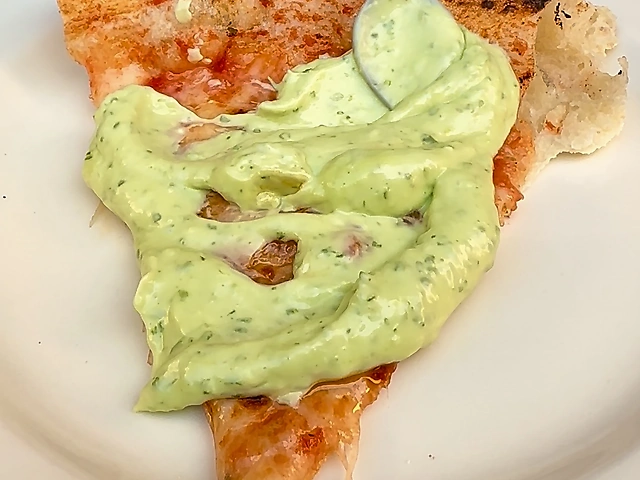 Піца на основі вершкового соусу з рваною яловичиною томленою у червоному вині, сиром моцарела, домашньою рікотою, та кисло-солодким смородовим соусом, посипається петрушкою