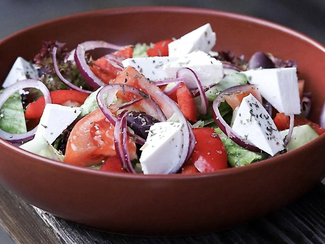 Огірки,помідори,солодкий перець, червона цибуля, сир фета та оливки каламата