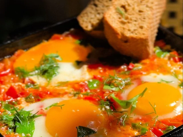 Яєчня у томатній сальсі з квасолею та запеченими баварськими ковбасками(яловичина) зі збитим крем-сиром та соусом Salsa Verde