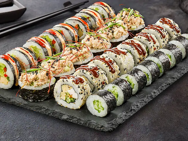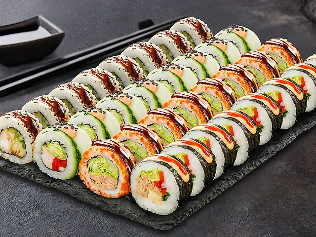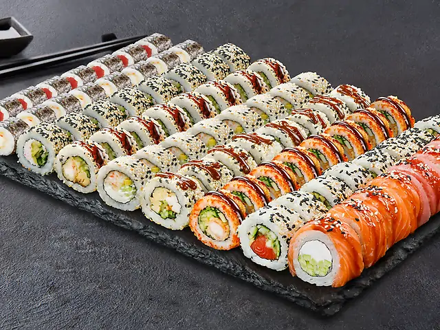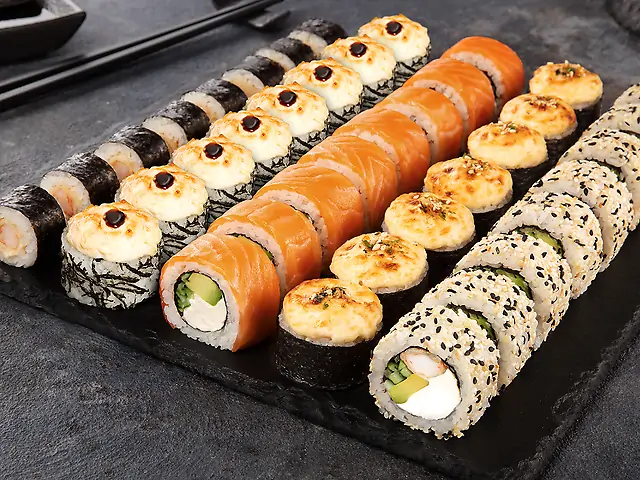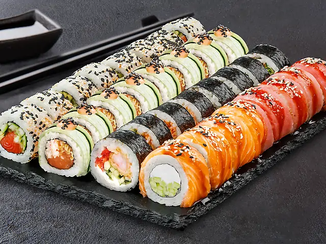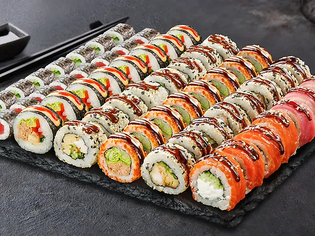 Філадельфія з лососем, Філадельфія з креветкою, Філадельфія з тунцем, Філадельфія з креветкою в кунжуті, Кранч з креветкою, Торі Рол (гострий), Запечений з крабовим міксом, Ніжний з куркою, Ніжний з лососем. Соєвий соус - 200 мл (5 шт). Імбир - 60 г. Васабі - 30 г.