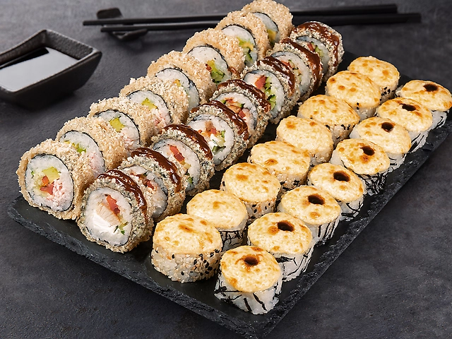 Філадельфія дует, Філадельфія з вугрем, Філадельфія з креветкою, Філадельфія з креветкою в кунжуті, Кранч з креветкою, Каліфорнія з крабовим міксом в ікрі, Каліфорнія з вугрем в кунжуті, Торі Рол (гострий), Ніжний з лососем, Запечений з креветкою, Каліфорнія темпура, Темпура рол з куркою. Соєвий соус - 240 мл (6 шт). Імбир - 70 г. Васабі - 35 г.