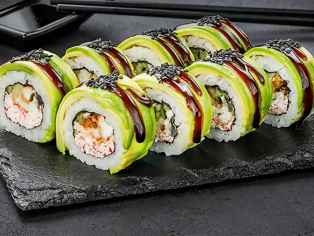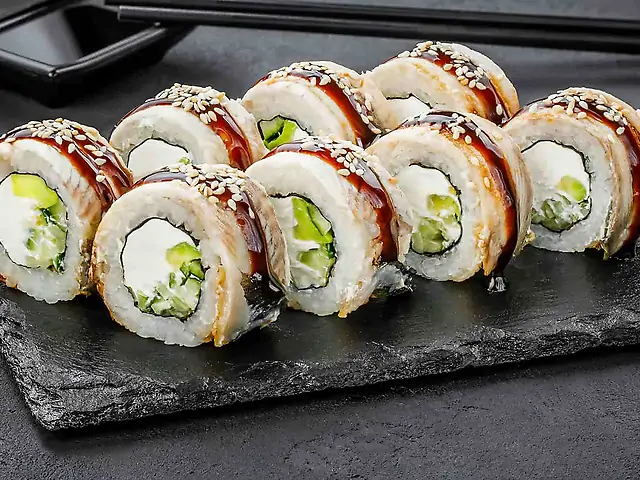 Філадельфія з лососем, Філадельфія з лососем в кунжуті, Філадельфія з тунцем, Філадельфія з креветкою в кунжуті, Філадельфія з креветкою, Каліфорнія з вугрем в кунжуті, Кранч з креветкою, Футомакі з креветкою у темпурі. Соєвий соус - 160 мл (4 шт). Імбир - 50 г. Васабі - 25 г.
