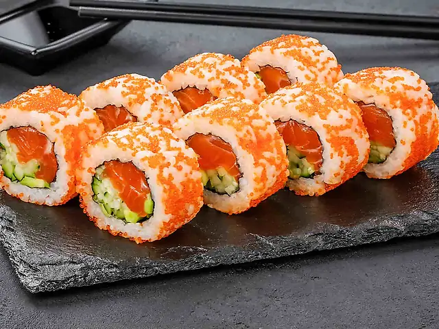 Філадельфія з лососем, Каліфорнія Чікен, Футомакі з лососем (гострий), Каліфорнія з крабовим міксом в кунжуті. Соєвий соус - 80 мл (2 шт). Імбир - 20 г. Васабі - 10 г.