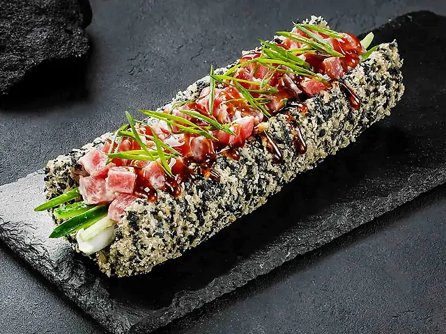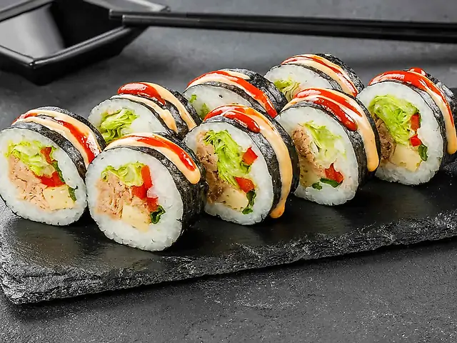 Кранч з тунцем, Роял Рол, Каліфорнія з креветкою в кунжуті, Футомакі з тунцем (гострий). Соєвий соус - 80 мл (2 шт). Імбир - 20 г. Васабі - 10 г.