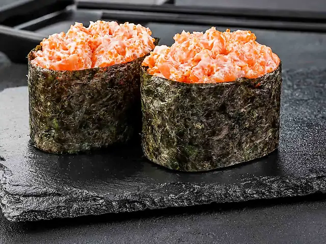 Ніжний з лососем, Ніжний з куркою, Запечений з крабовим міксом. Соєвий соус - 80 мл (2 шт). Імбир - 20 г. Васабі - 10 г.