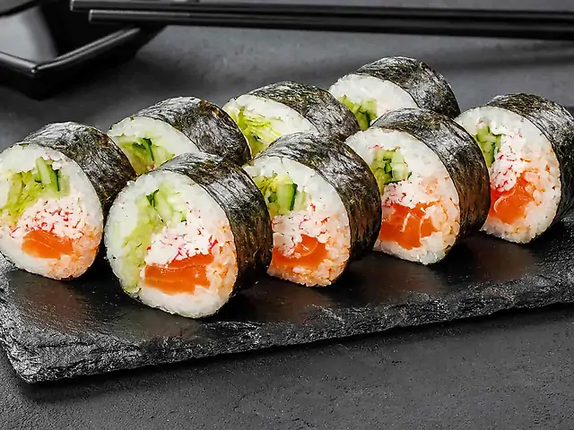 Рис, лосось, крем сир, авокадо, огірок, норі