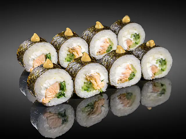 Рис, норі, сир вершковий, мікс краб, огірок, тунець, ікра масаго, соус спайс, кунжут мікс