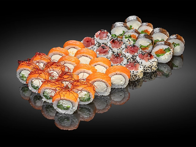 рол філадельфія тунець тамаго 4 шт <br>рол філа сурімі 4 шт <br>рол філадельфія у кунжуті <br>рол аляска з креветкою 4 шт <br>рол два сира 4 шт