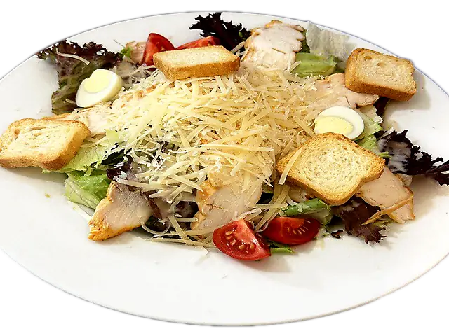 Куряче мʼясо, айсберг, листя салатів, соус, пармезан, помідор черрі, перепелині яйця, сухарики.
