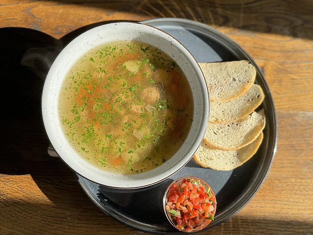Куряче м'ясо у вершках, зі спеціями, часником, зеленню, подається з чіабатою