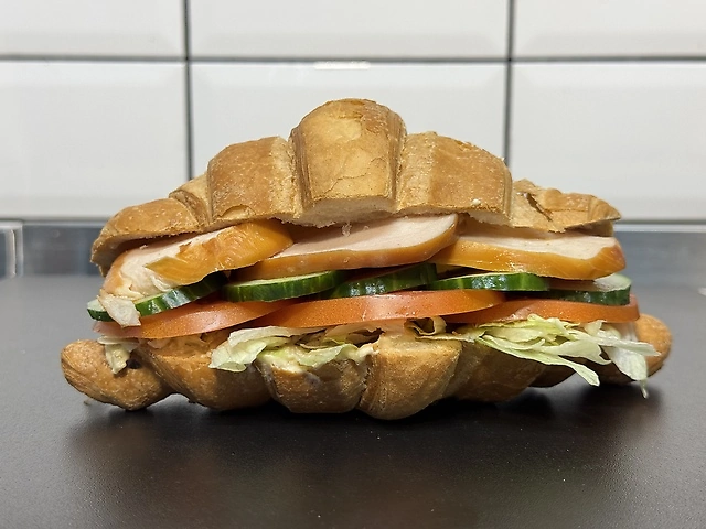 Круасан-сендвіч із куркою та пармезаном : це поєднання соковитої запеченої курки, ароматного пармезану, свіжих томатів і хрусткого айсберга. Завершує смакову гармонію ніжний соус ремолад, додаючи витончену пікантність кожному шматочку.