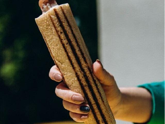 Нова булочка донер, дві курячі сосискі, соус фірмовий білий часниковий та кетчуп, зелень, маринована цибуля, морква по корейські.
