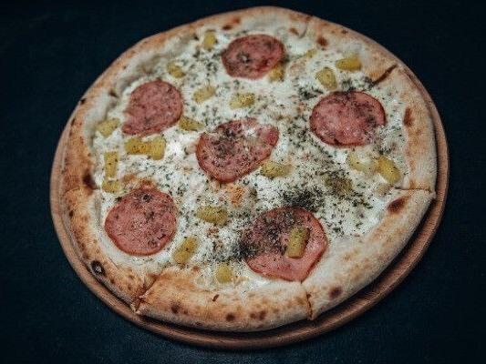 На тонкому коржі діаметром 35 см соус сирний, моцарела, шинка, ананас, орегано.
