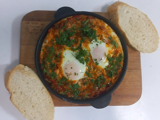 З тигровими креветками, мідіями, перцем чолі, філе білої риби та часниковими грінками