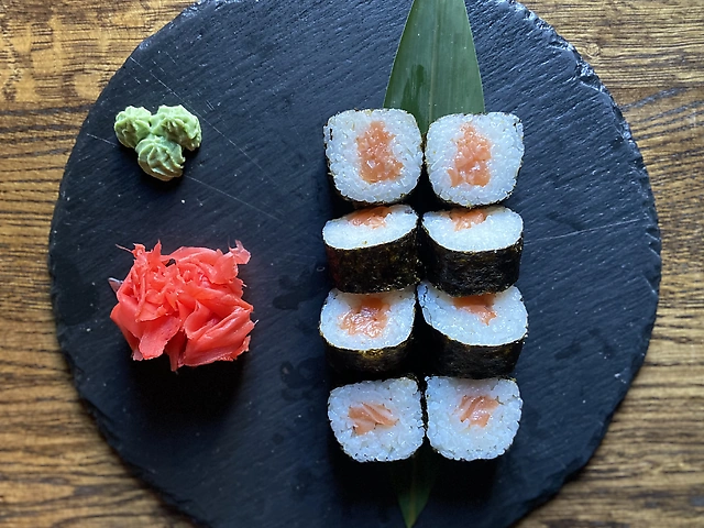 Норі, японський рис, лосось, крем-сир, огірок, тобіко, соус кімчі