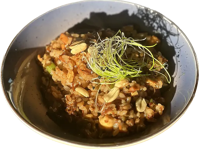 Рис, яйце, цибуля, морква, стручкова квасоля, печериці, арахіс, індичка, соус на вибір